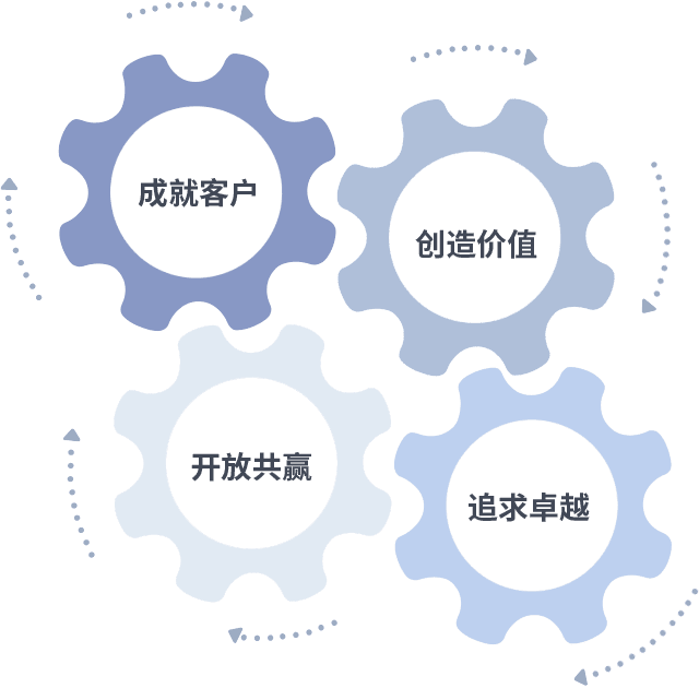 成就客户是一切决策的出发点,,创造价值是衡量所有工作的标准,,,,追求卓越是我们做事做人的态度,,,开放共赢是我们的格局也是最终的结果。。。。价值观的齿轮环环相扣,,,推动着组织里的每个人不断向前。。。
